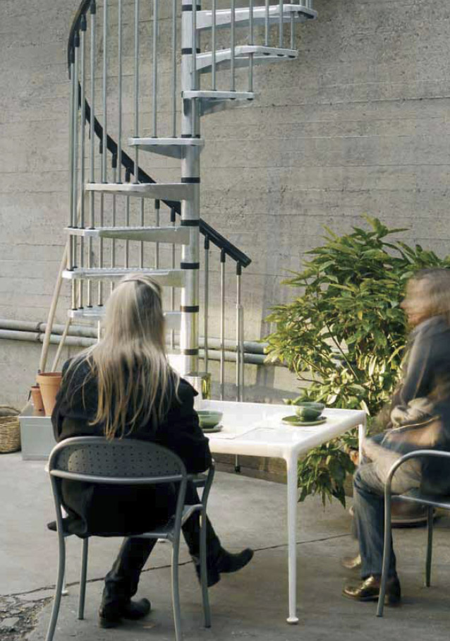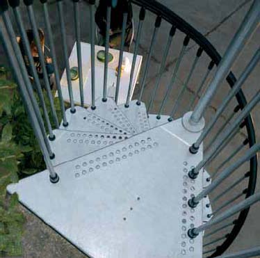 Stabile und einfach zu montierende Spindeltreppe für Außenbereiche, z.B. als Flucht- oder Gartentreppe.