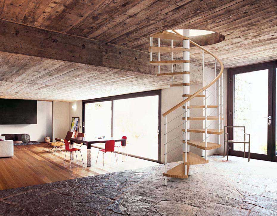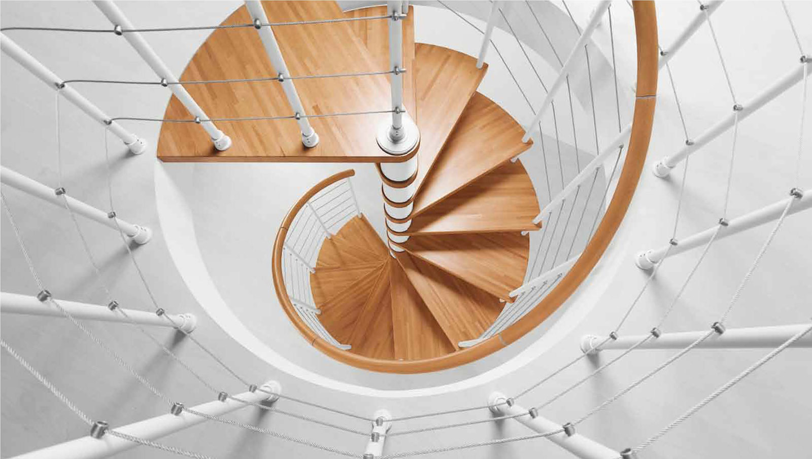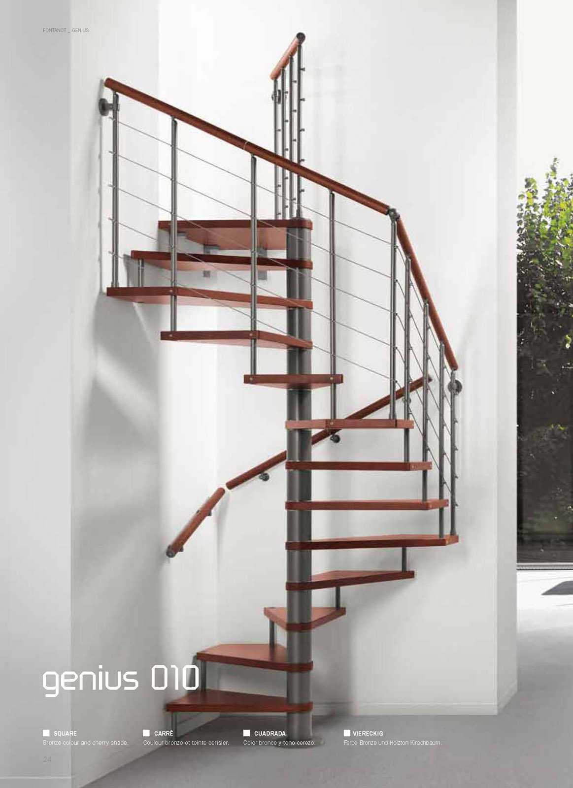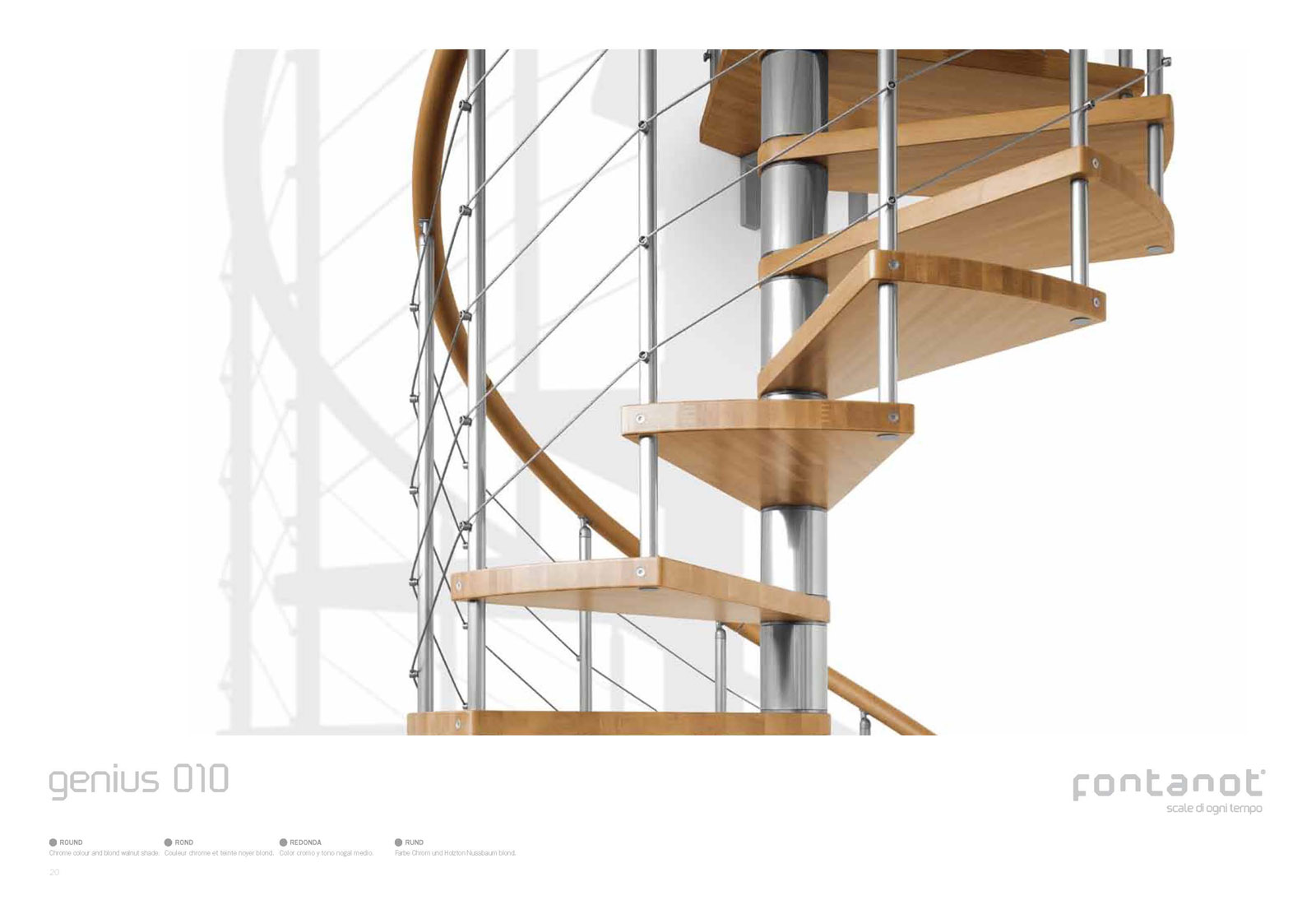 Genius 010 ist mit rundem oder rechteckigem Grundriss oder als Mittelholmtreppe erhältlich. Mit Hilfe durchsichtiger Distanzstücke aus Polykarbonat sind alle Treppen Genius 010 höhenverstellbar.