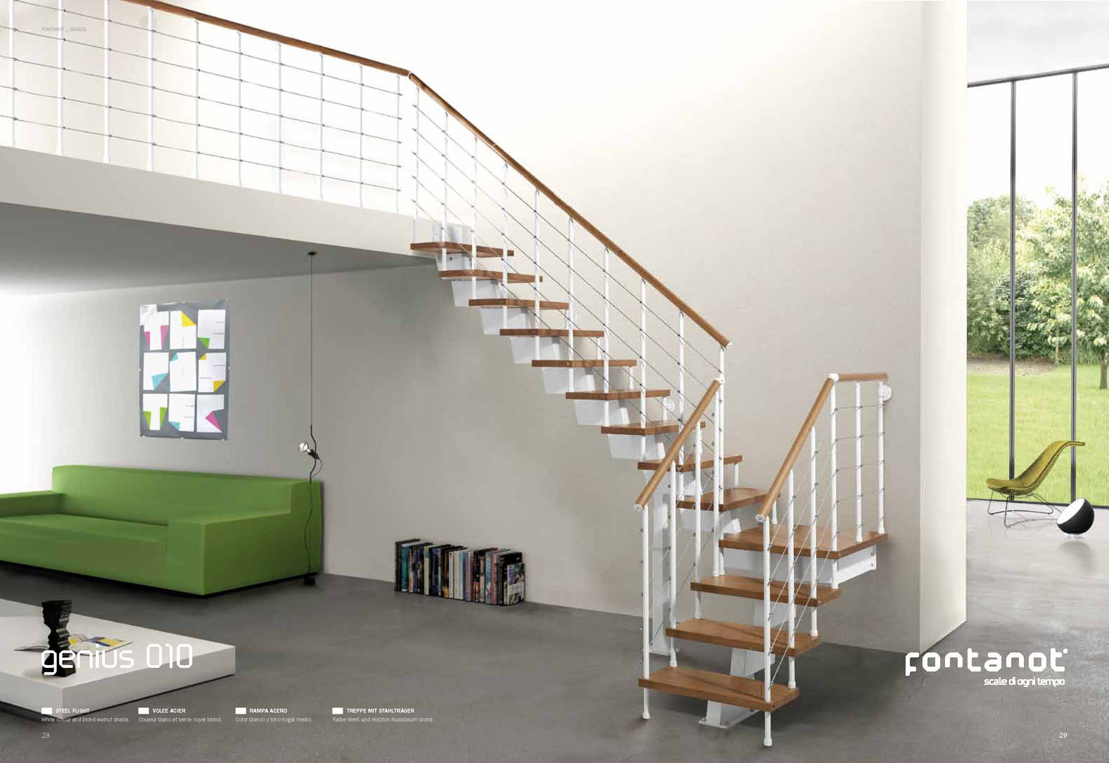 Die Treppen der Kollektion Genius zeichnen sich durch die solide Beschaffenheit der Stufen und des Handlaufs der Geländer aus, die beide aus massivem Buchenholz bestehen und in vier verschiedenen Holztönen erhältlich sind.