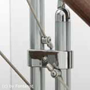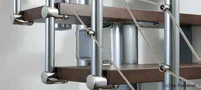 Mittelholmtreppe mit Geländer aus Edelstahlkabeln, die auf fünf verschiedene Arten überkreuzt werden können.
