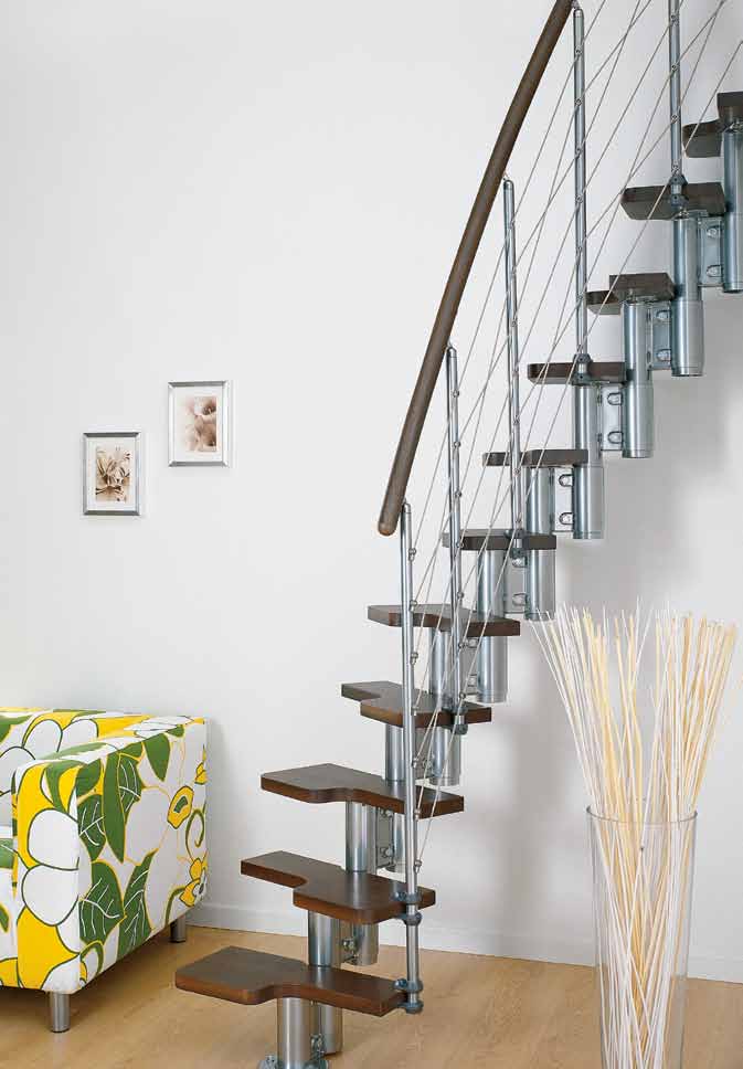 Mini Line ist die Treppe mit der passenden Größe für kleine Räume. Sie besteht aus lackierten Stahlträgern mit Befestigungselementen in der Farbe der Träger. Die entsprechend profilierten und versetzt befestigten, 54 cm breiten Stufen aus massivem Holz erleichtern die Benutzbarkeit und minimieren den Raumbedarf. Das Geländer besteht aus lackierten Stahlstäben und Edelstahlkabeln, die auf 5 verschiedene Arten überkreuzt werden können. Der Handlauf aus PVC mit Aluminiumkern in Holzoptik ist farblich auf die Stufen abgestimmt.