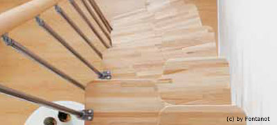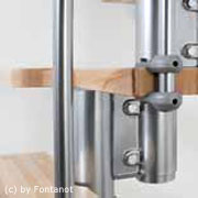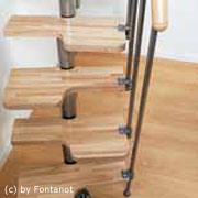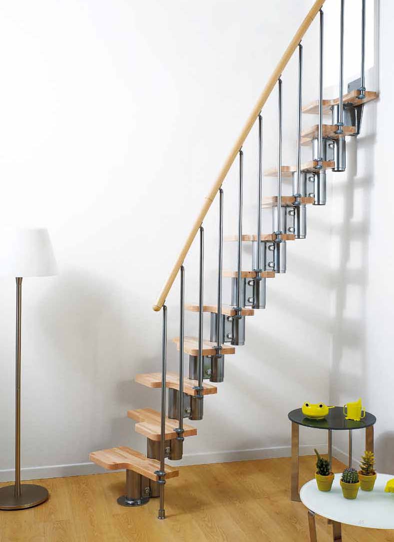 Mini ist eine Treppe, die für kleinste Räume geeignet ist. Sie besteht aus lackierten Stahlträgern mit Befestigungselementen in der Farbe der Träger. Die entsprechend profilierten und versetzt befestigten, 54 cm breiten Stufen aus massivem Holz erleichtern die Benutzbarkeit und minimieren den Raumbedarf. Das Geländer besteht aus lackierten Stahlstäben. Der Handlauf in Holzoptik aus PVC mit Aluminiumkern wird farblich auf die Stufen abgestimmt.