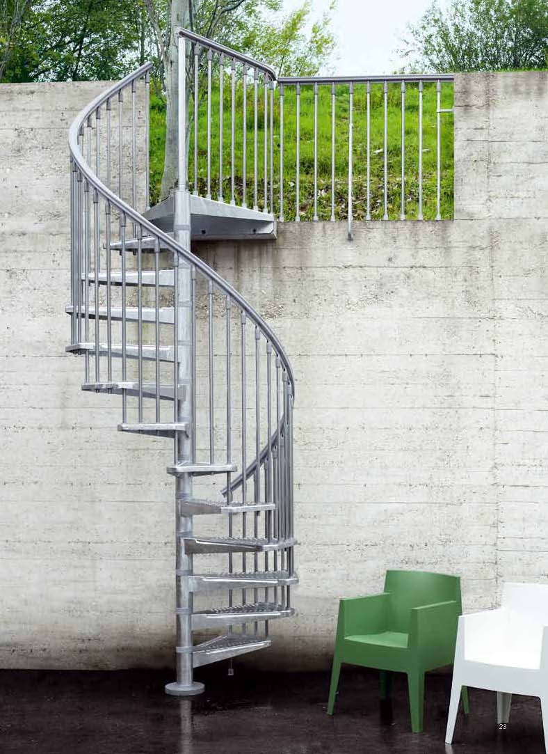 Steel Zink ist eine Spindeltreppe für den Außenbereich aus feuerverzinktem Stahl.