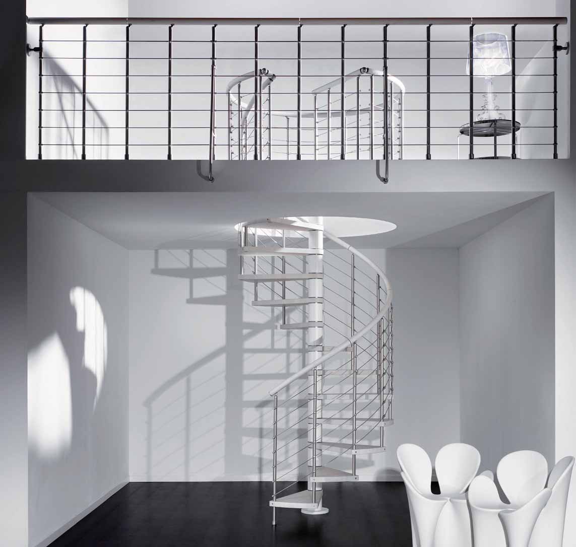 Die Treppe zeichnet sich durch Stützen aus lackiertem Stahl und durchsichtigen Distanzringen aus Polykarbonat aus, mit denen die Höhe eingestellt werden kann.