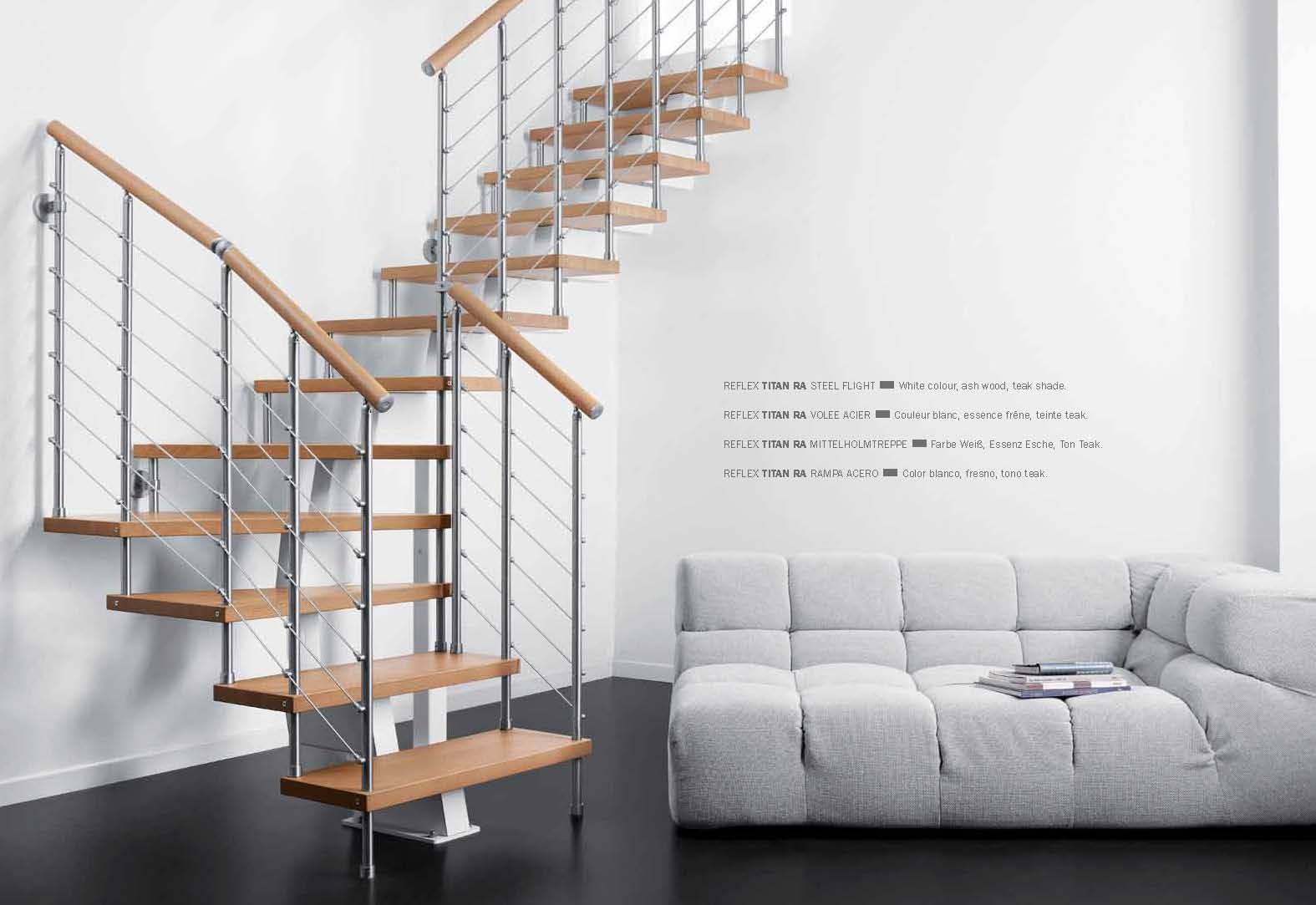 REFLEX TITAN besteht aus Stufen aus massiver, natürlicher Buche oder Esche mit 42 mm Stärke, einem Handlauf aus massivem Holz und Geländersäulen aus Edelstahl in seidenmatter Ausführung, mit rundem Querschnitt und 27 mm Durchmesser.