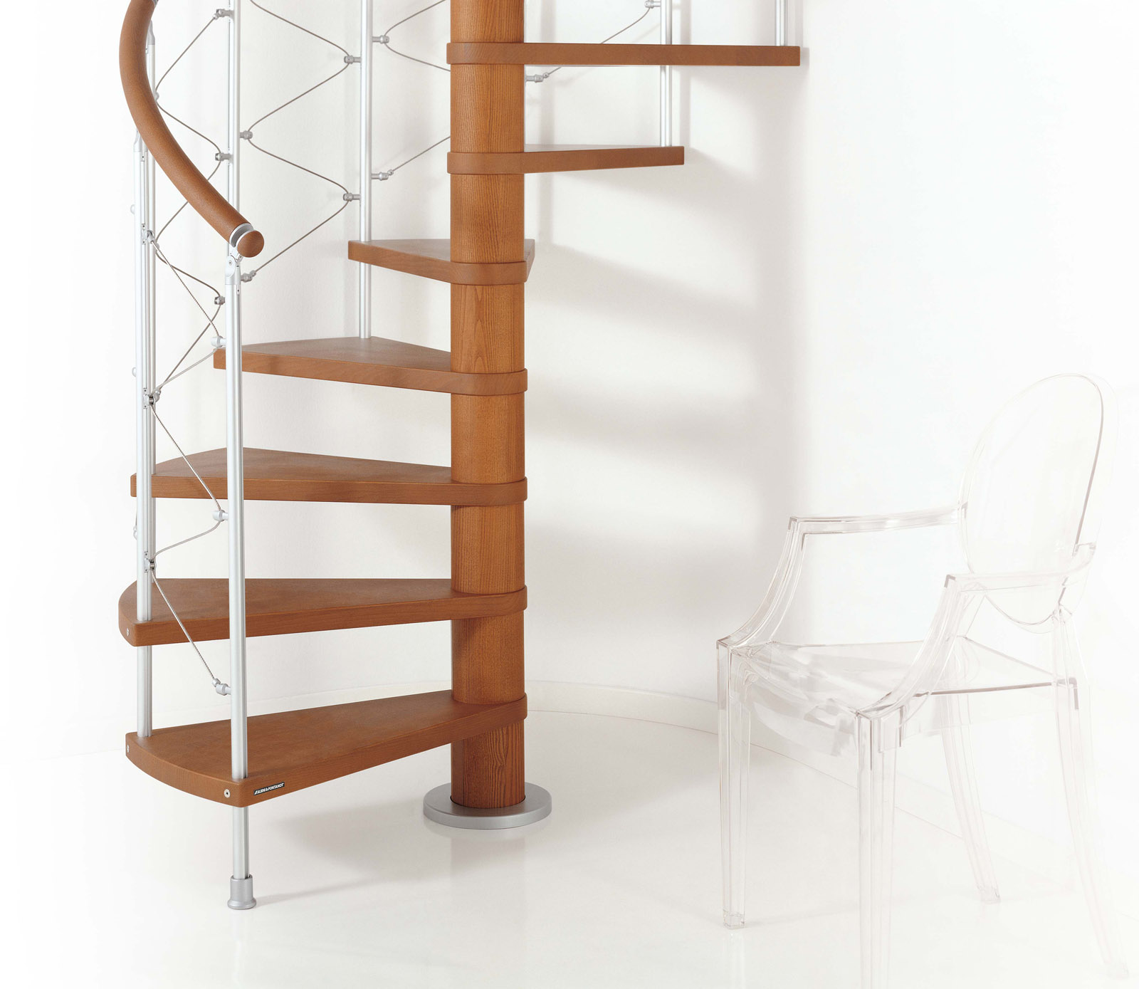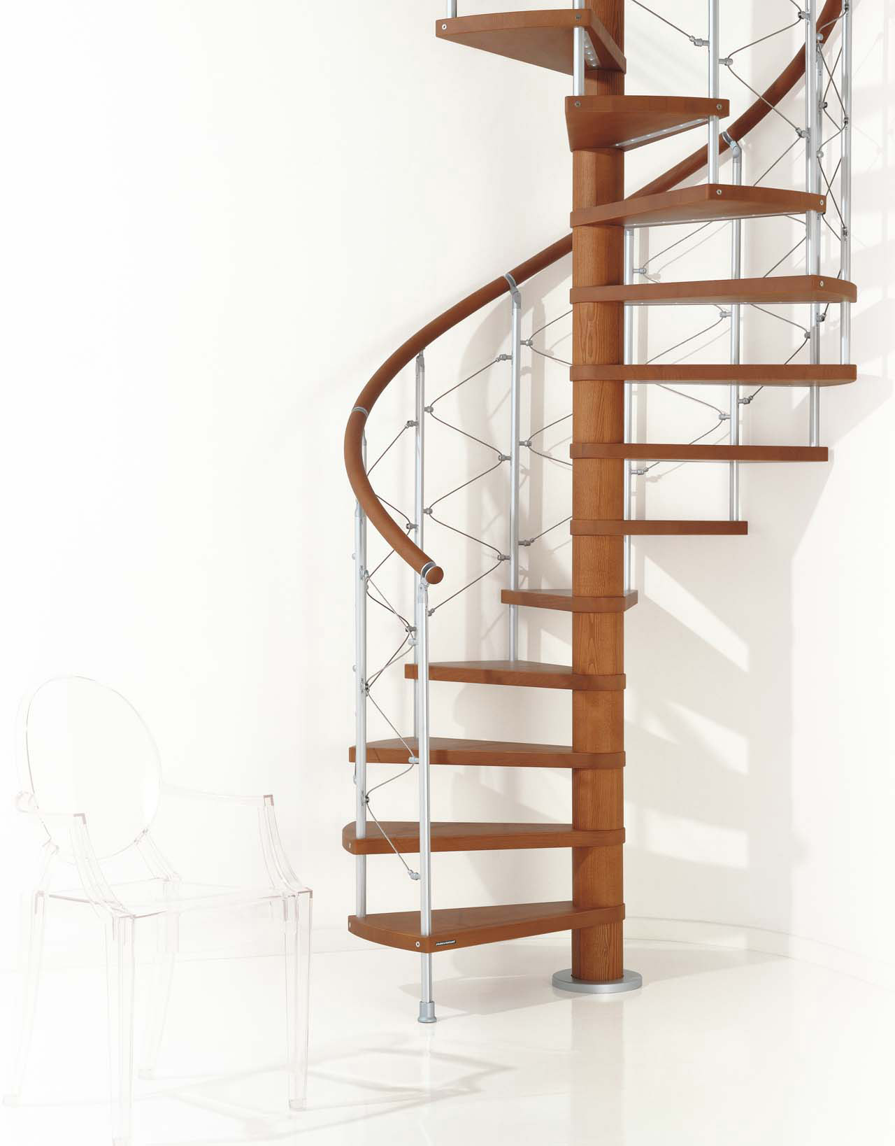 Die Spindeltreppe Sport besteht aus eleganten Stufen aus Esche und einem Aluminiumgeländer.