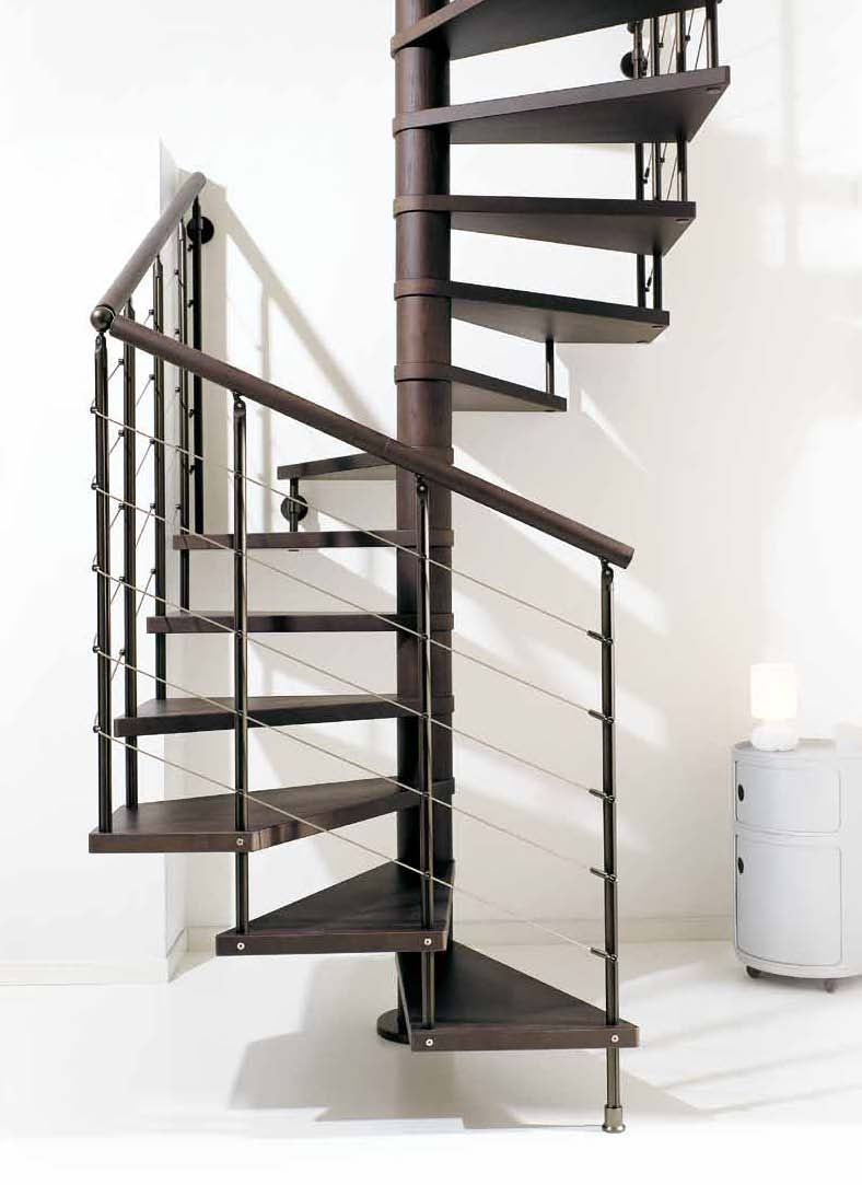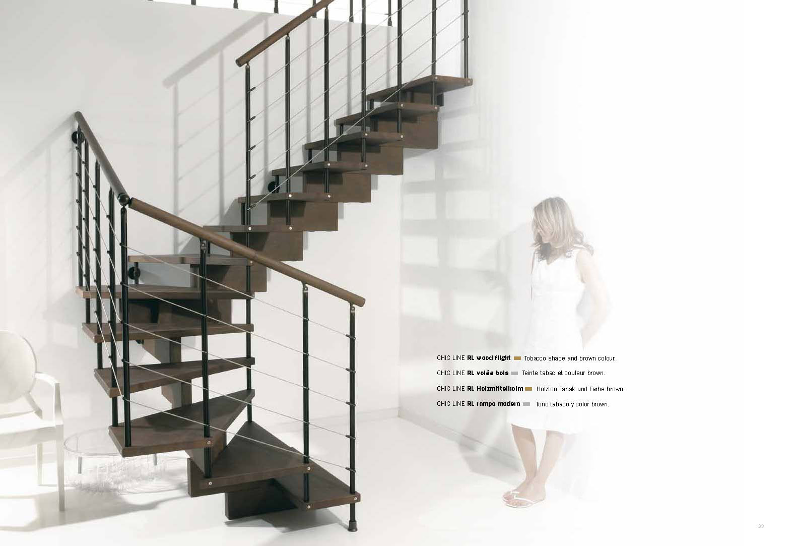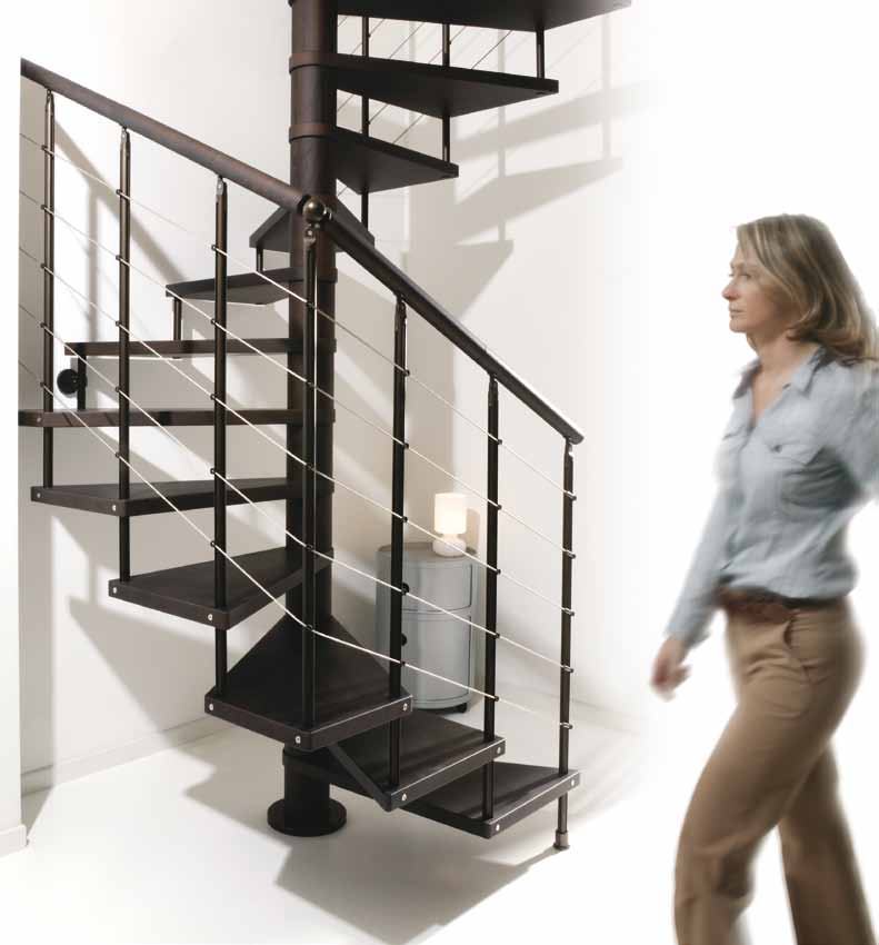 Das Geländer Chic Line aus seidenmattem Stahl in der Farbe Silver oder Brown lackiert ist für runde Spindeltreppen T oder viereckige Modelle Q sowie für Mittelholmtreppen mit Holzkonstruktion RL oder Stahlkonstruktion RA erhältlich.