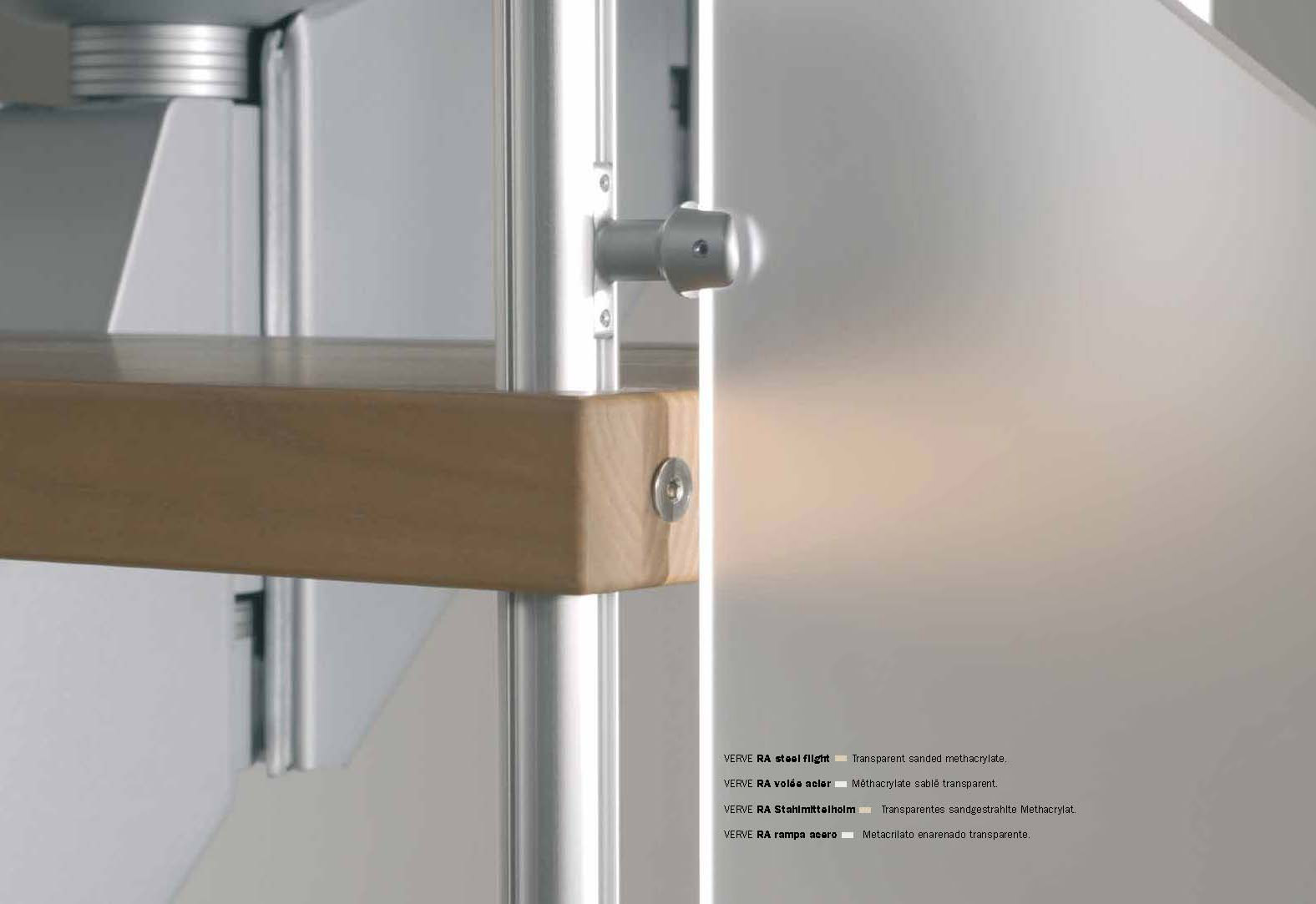 Das Geländer Verve besteht aus durchsichtigen oder in Brown gehaltenen, zweifach sandgestrahlten Paneelen aus Methacrylat, die an Aluminiumpfosten befestigt sind, auf denen der Handlauf aus Massivholz liegt.