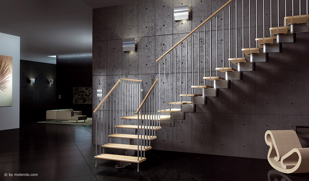 Die Treppe hat als Standard eine Wendung mit drei Stufen. Optional mit vier Stufen oder Podest in der Wendung erhältlich.