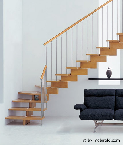 Die Stufen aus Holz haben geschwungene Stufenvorderkanten und können in der Auftrittstiefe verstellt werden.