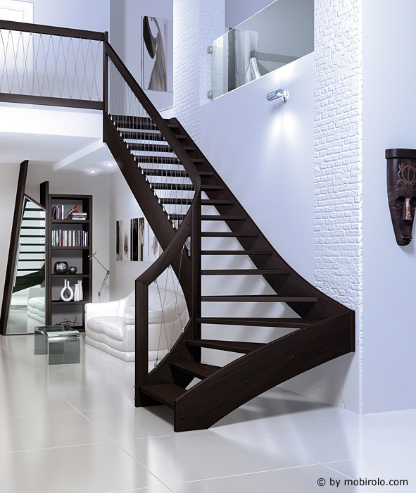 Die Holzwangentreppe Vertigo gibt dem Raum mehr Transparenz durch Geländer aus Stahlseilen.